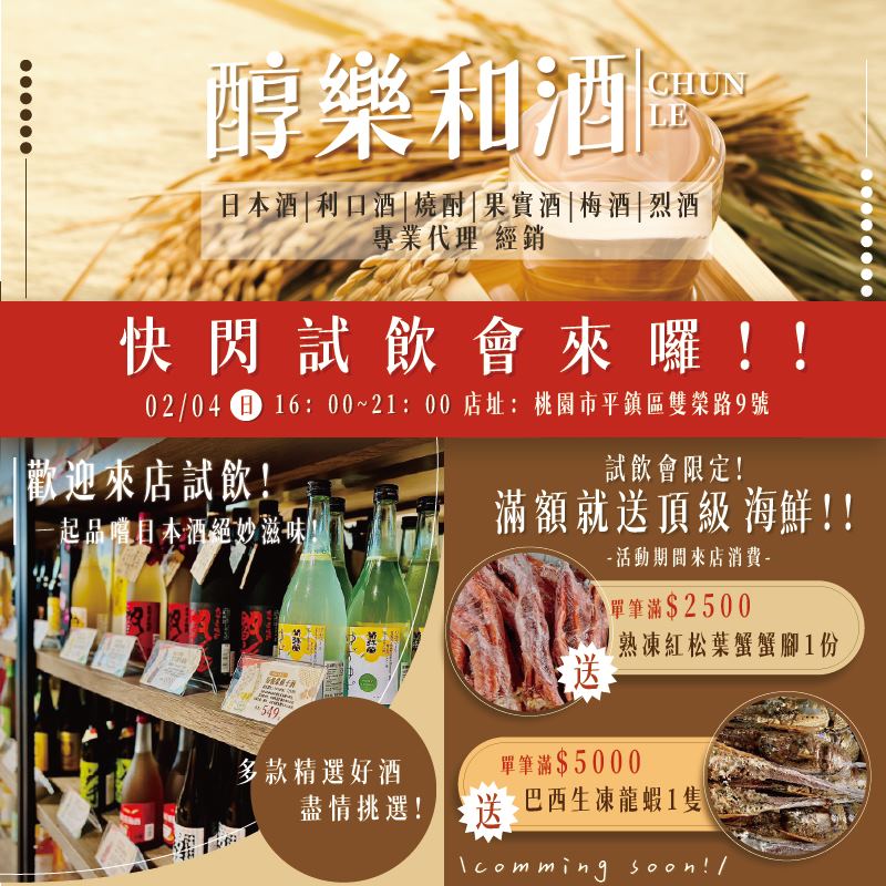 醇樂和酒 快閃試飲會 我們將在2/4 16:00-21:00 與大家見面嘍 快閃當天 !! 單筆購買滿2500元 即贈熟凍紅松葉蟹腳一份!! 單筆購買滿5000元即贈巴西生凍龍蝦一隻!! 滿額贈禮方案不重覆領取 買酒送海鮮 霸氣的老闆 當天會有許多我們精挑細選的商品在現場可試飲喔!! 現場有百來款酒類商品 歡迎來現場參觀選購挑選喜歡的商品 期待與您相見~~~